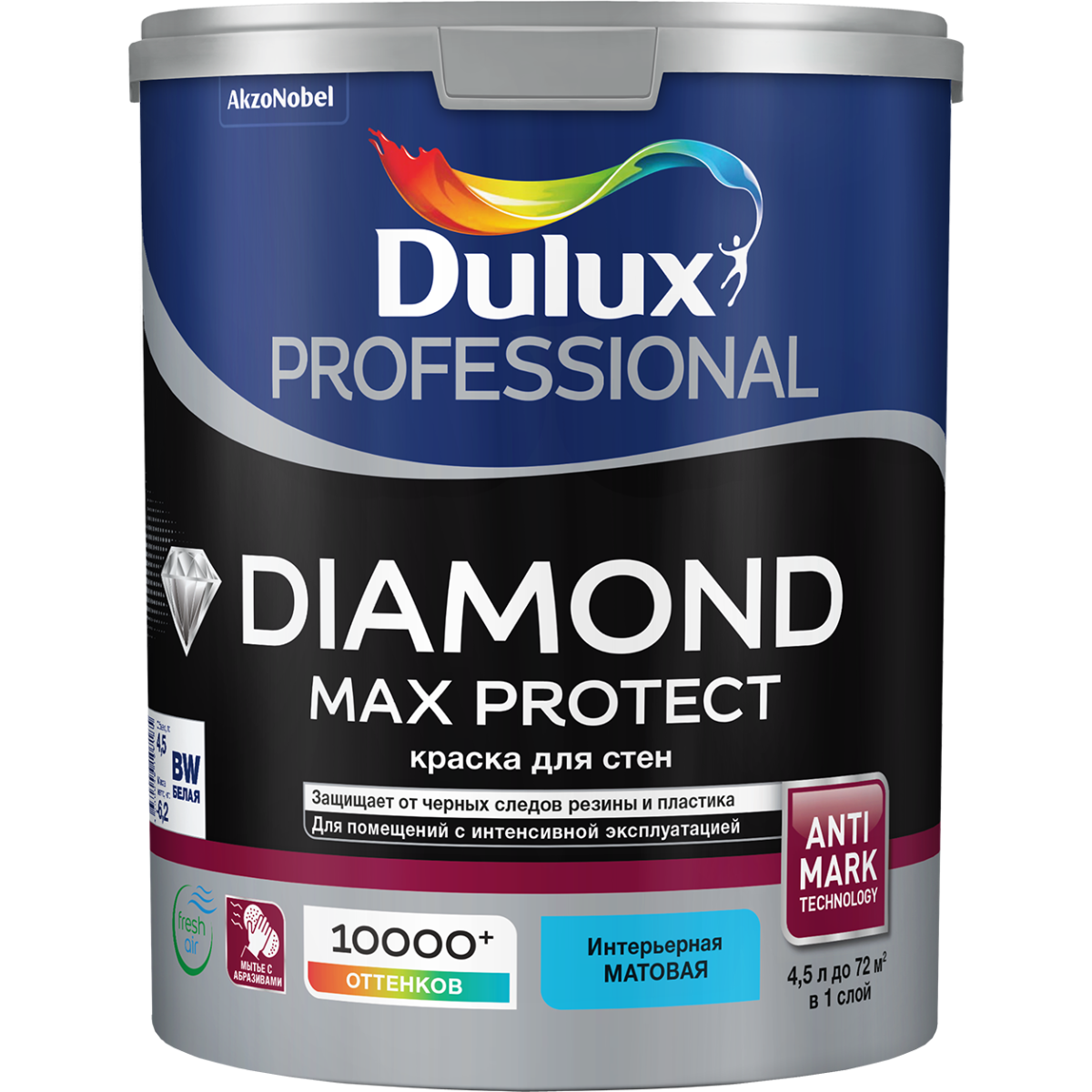 Dulux Professional Diamond Max Protect – это прочная матовая краска на основе водной дисперсии. В 10 раз крепче обычных красок для интерьера. Имеет устойчивость к дезинфицирующим растворам и уайт-спириту, а также к истиранию. Защищает стены в общественных и жилых помещениях. Повышенная эксплуатация и большой поток людей не являются угрозой для покрытия. Материал является максимально укрывистым, лишён выраженного запаха. Имеет способность визуально скрывать мелкие дефекты окрашиваемой поверхности. Краска создана с помощью специальной технологии Anti Mark Technology, которая создаёт невидимый для глаз барьер на поверхности, тем самым уменьшая контакт с пластиком или резиной, оставляющими следы. Окрашенная поверхность сохраняет свежесть в течение долгого времени и не требует каждый год новой обработки.