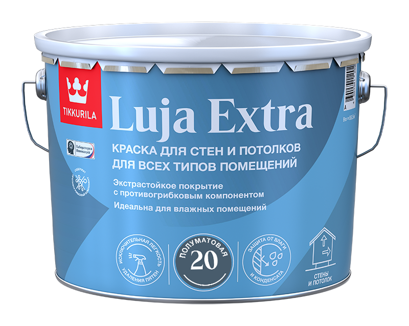 Краска Tikkurila Luja Extra 20 для стен и потолков для всех типов помещений. Создает экстрастойкое покрытие с противогрибковым компонентом. Идеальна для влажных помещений.