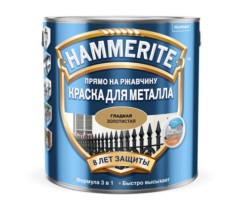 Краска для металла гладкая глянцевая прямо по ржавчине Hammerite с формулой 3 в 1 (грунт, ингибитор коррозии, финишное покрытие). Имеет в своем составе антикоррозийные и силиконовые добавки. Применяется для цветных и черных металлов, легко и быстро защищает металл от ржавчины, придает красивый внешний вид поверхности. Краска свободно наносится и гарантирует прочное антикоррозийное покрытие и эффективную защиту от ржавчины на протяжении 8 лет.